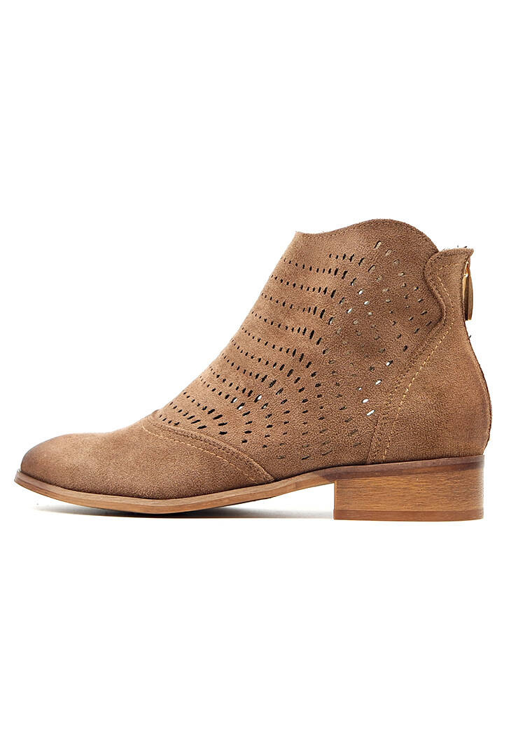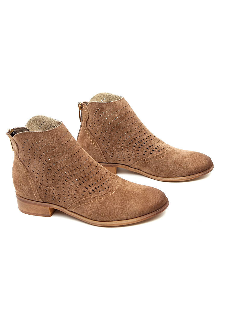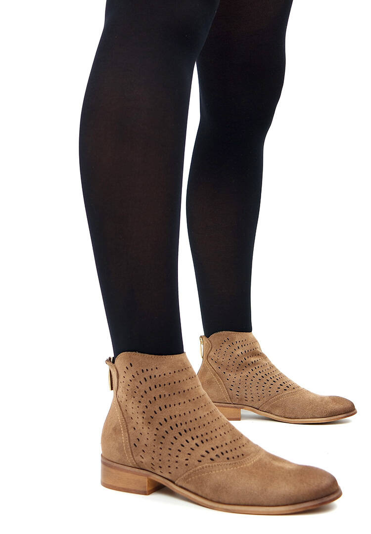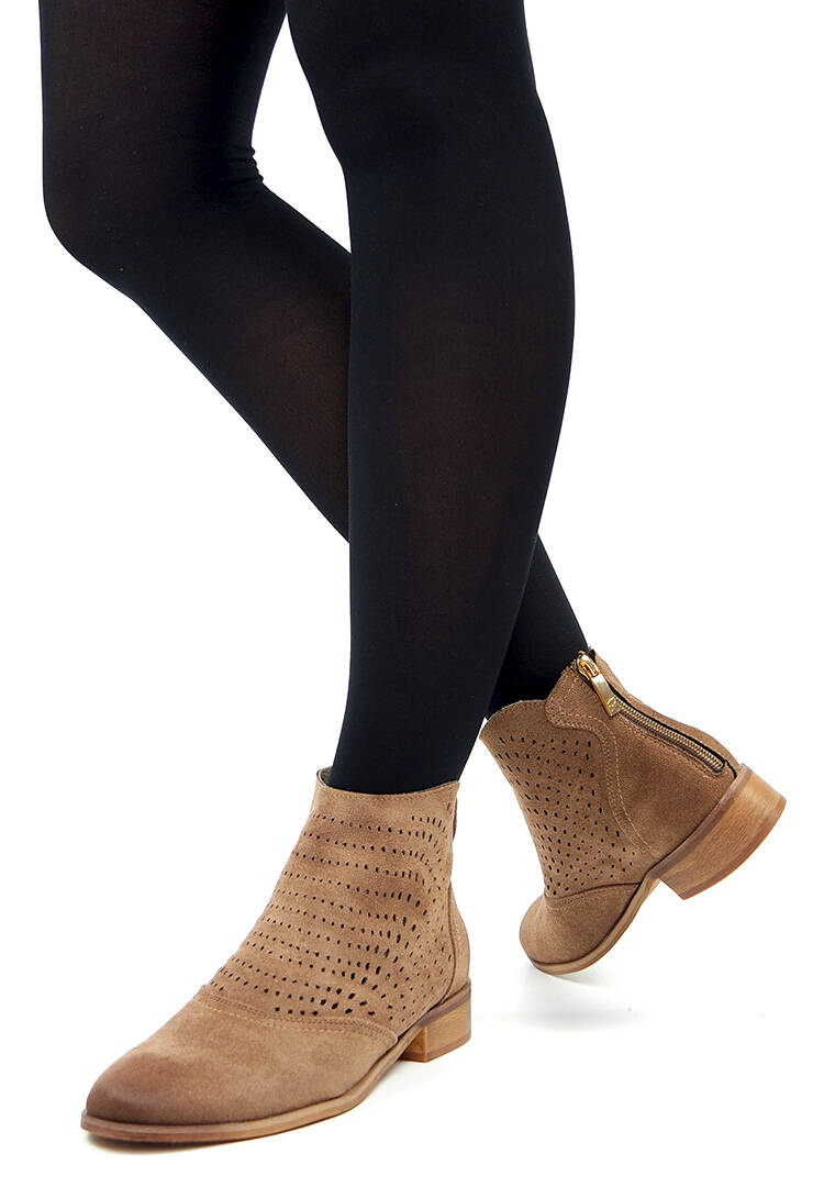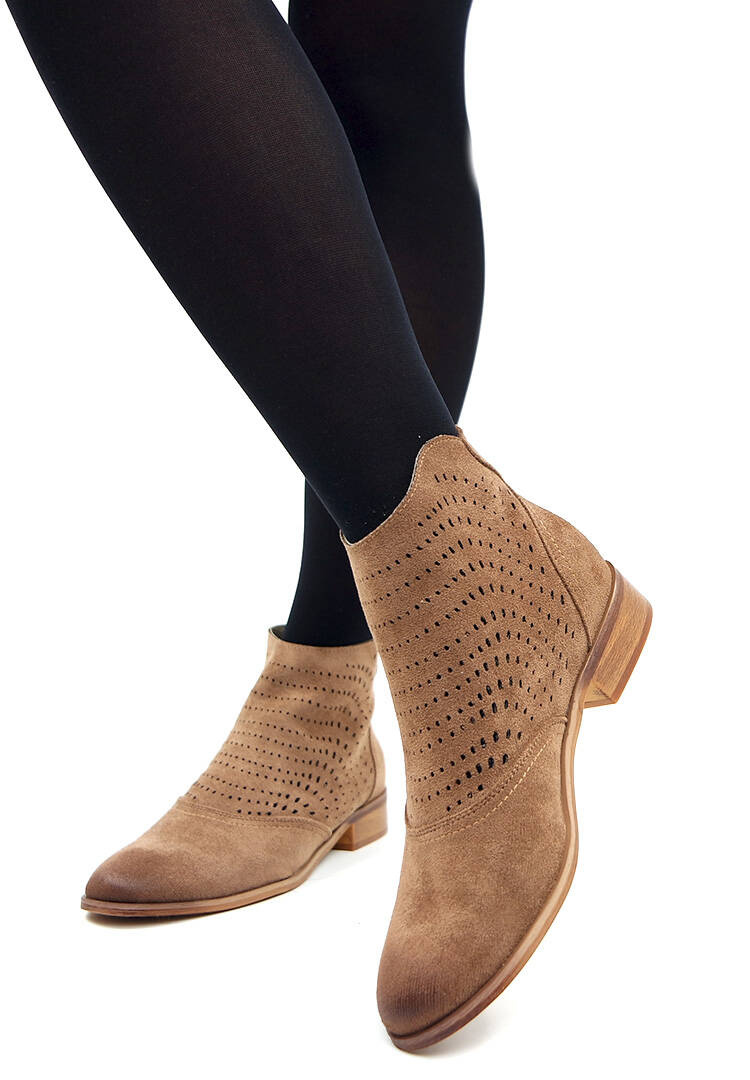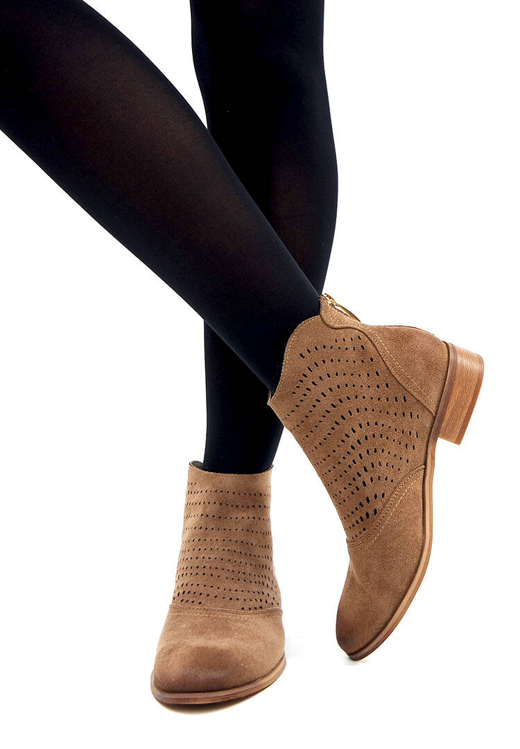 Damskie krótkie botki z modnymi ażurowymi wycięciami. Zapinane na suwak z tyłu buta na pięcie. Wytrzymała podeszwa. But osadzony na niskim klockowym obcasie o wysokości 3 cm. Szerokość u góry cholewki - ok. 29 cm. Długość cholewki ok 10 cm. Produkt renomowanej firmy Potocki. Piękne ażurowe botki na wiosnę. W środku wkładka ze skóry naturalnej. Płaskie damskie botki na każdą okazję.