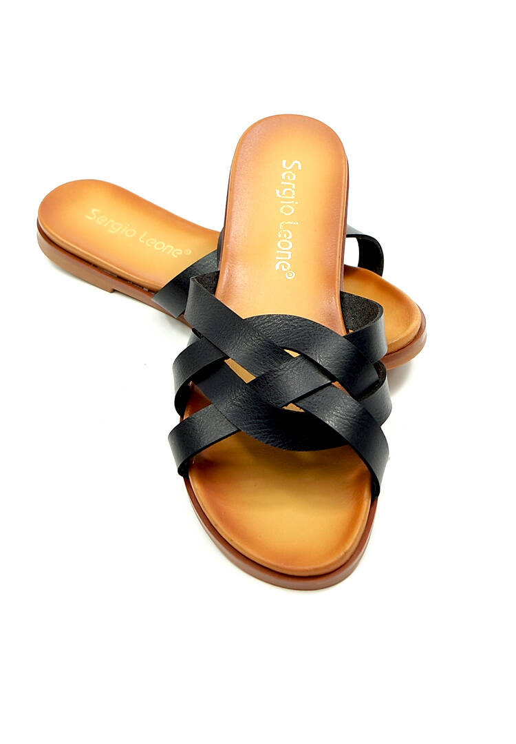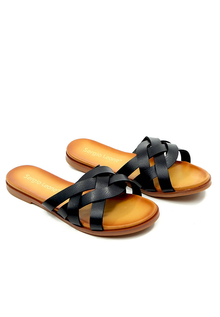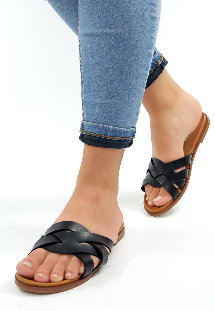 Damskie modne płaskie klapki. Modna pleciona cholewka. Model lekki z elastyczną podeszwą. Klapki damskie idealne do spodni i eleganckiej sukienki. Damskie płaskie klapki marki Sergio Leone.