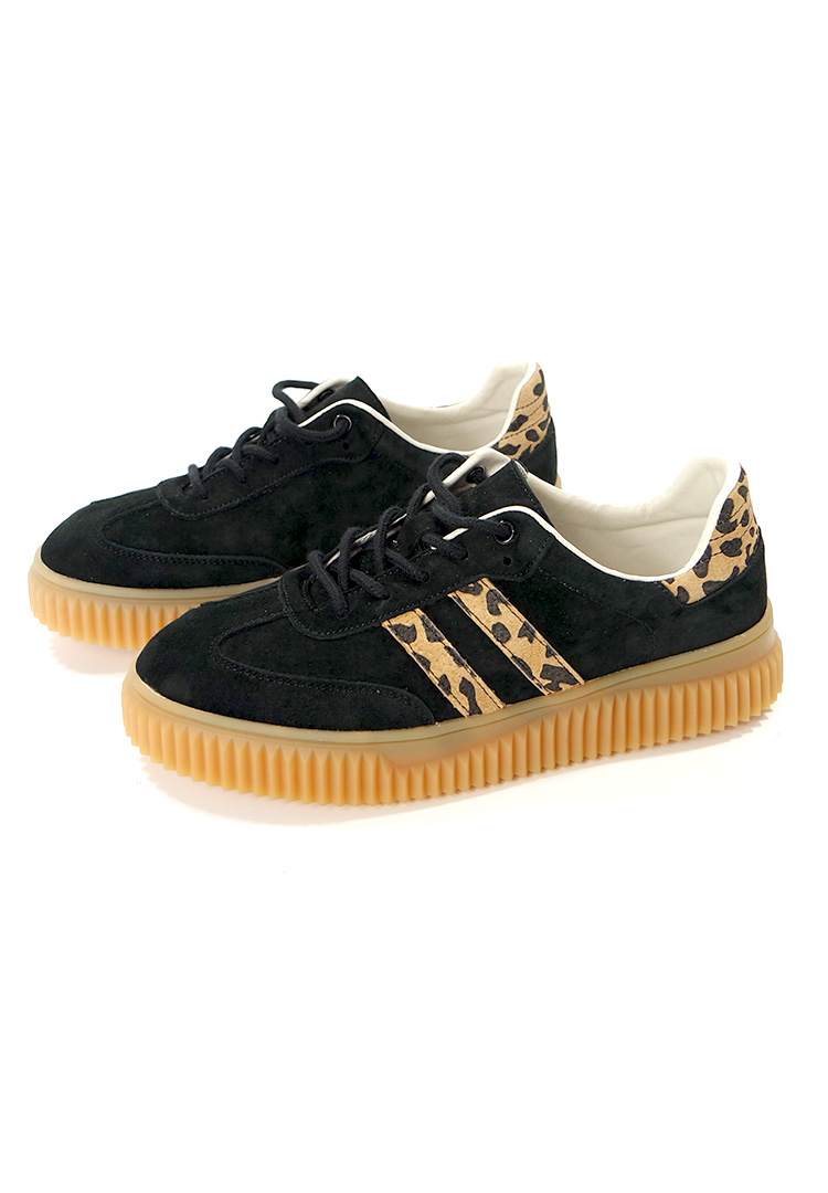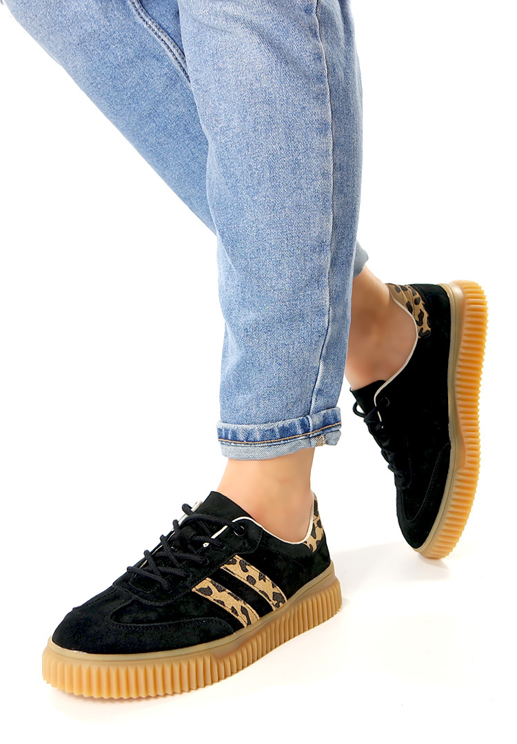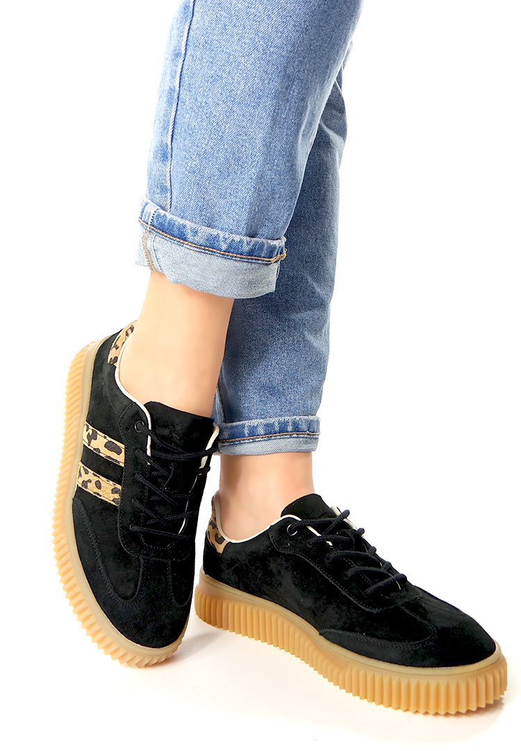 Damskie czarne lekkie skórzane obuwie sportowe półbuty z panterką