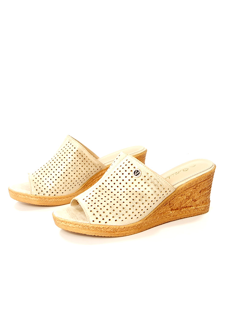 Model obuwia dla Pań ceniących sobie oryginalny styl i komfort chodzenia. Damskie bardzo lekkie klapki osadzone na koturnie. Posiada bardzo miękką wkładkę ze skóry maturalnej. Buty wykonane z miękkiego ażurowego materiału, idealnie dopasowującego się do stopy. Obuwie na wesele, komunię, studniówki, bale i inne imprezy okolicznościowe, idealne na przebranie. Pasuje zarówno do spodni, spódnicy i sukienki. Obuwie renomowanej marki Skotnicki. Klapki damskie na wytrzymałym spodzie. Idealnie przytrzymujące stopę. Klapki damskie na wysokim koturnie z tworzywa sztucznego imitującego pleciony sznurek.