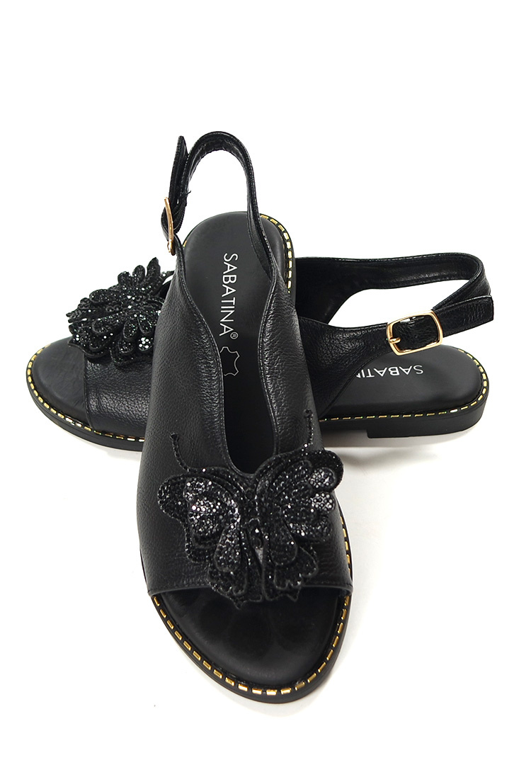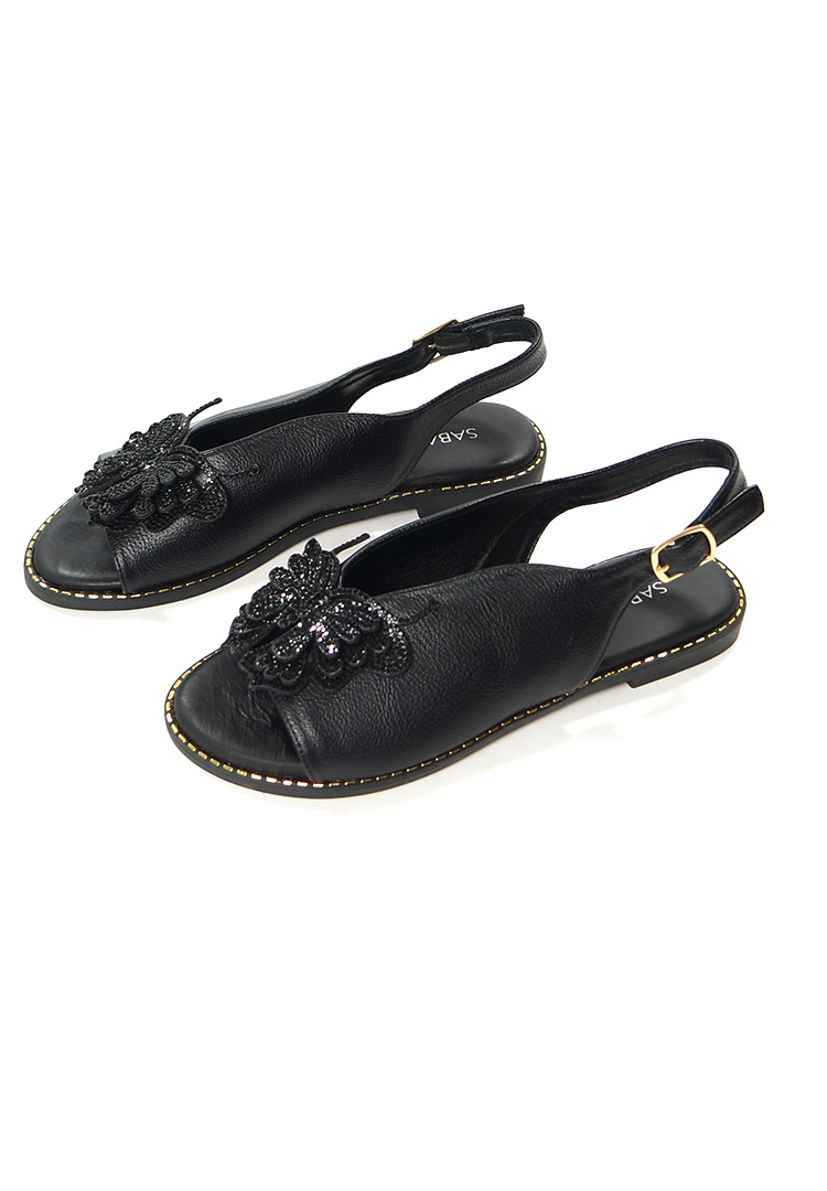 Damskie czarne płaskie sandały z motylem wkładka skórzana