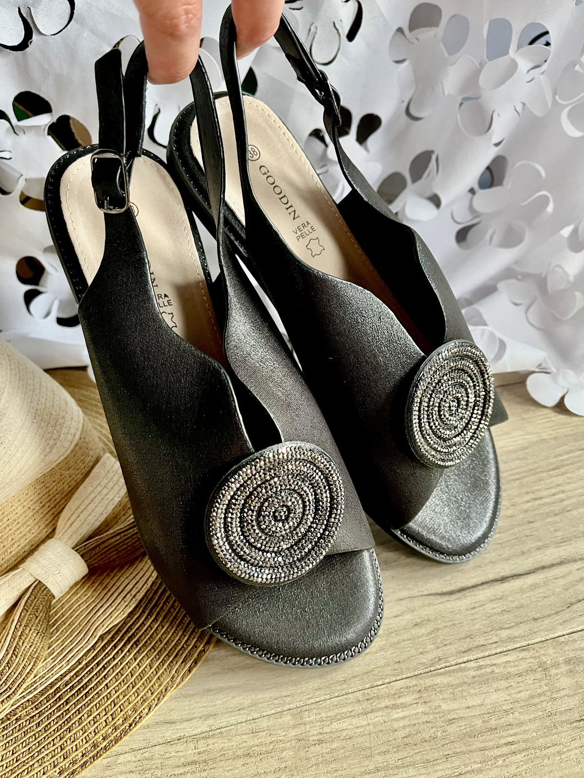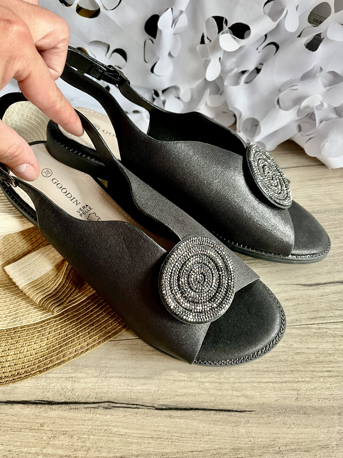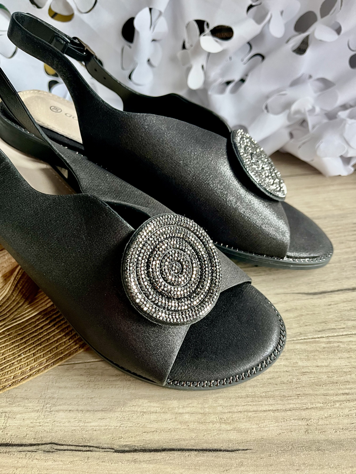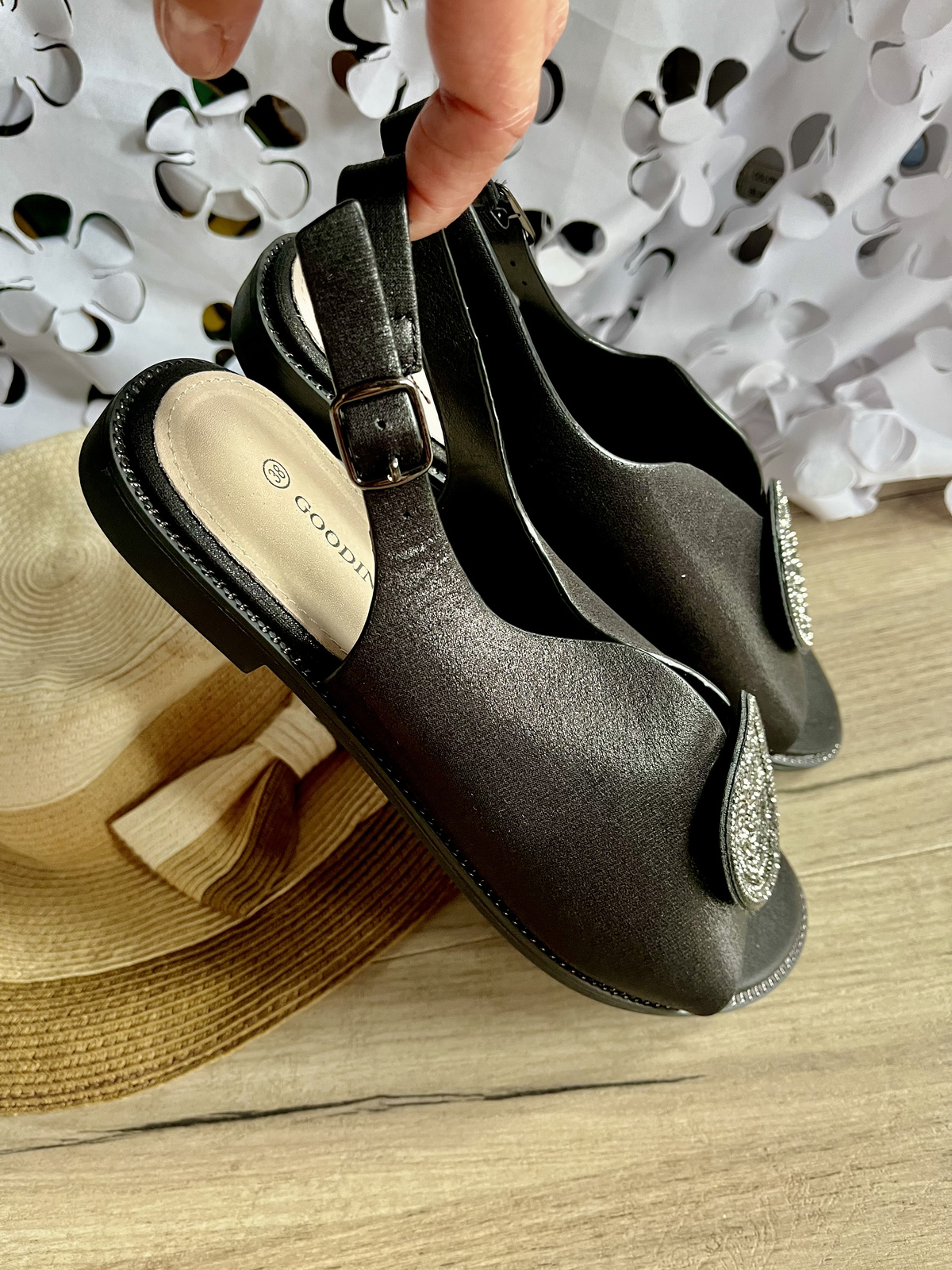 Model obuwia dla Pań ceniących sobie oryginalny styl i komfort chodzenia. Modny fason osadzony na płaskiej podeszwie, z miękką piankową wkładką ze skóry naturalnej w środku. Buty wykonane z bardzo miękkiego materiału. Wygodne sandały damskie z miękkiego materiału na wiosnę i lato. Sandałki zapinane na sprzączkę za piętą z regulacją. Damskie sandały idealne na przebranie na imprezę. Wygodne buty do tańczenia na weselu. Damskie sandały na komunię, wesele. Sandały damskie z przyszytą na przodzie materiałową ozdobą, wysadzaną błyszczącymi dżetami. Obuwie renomowanej marki Goodin.