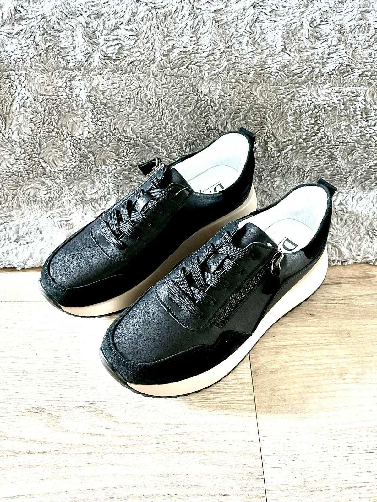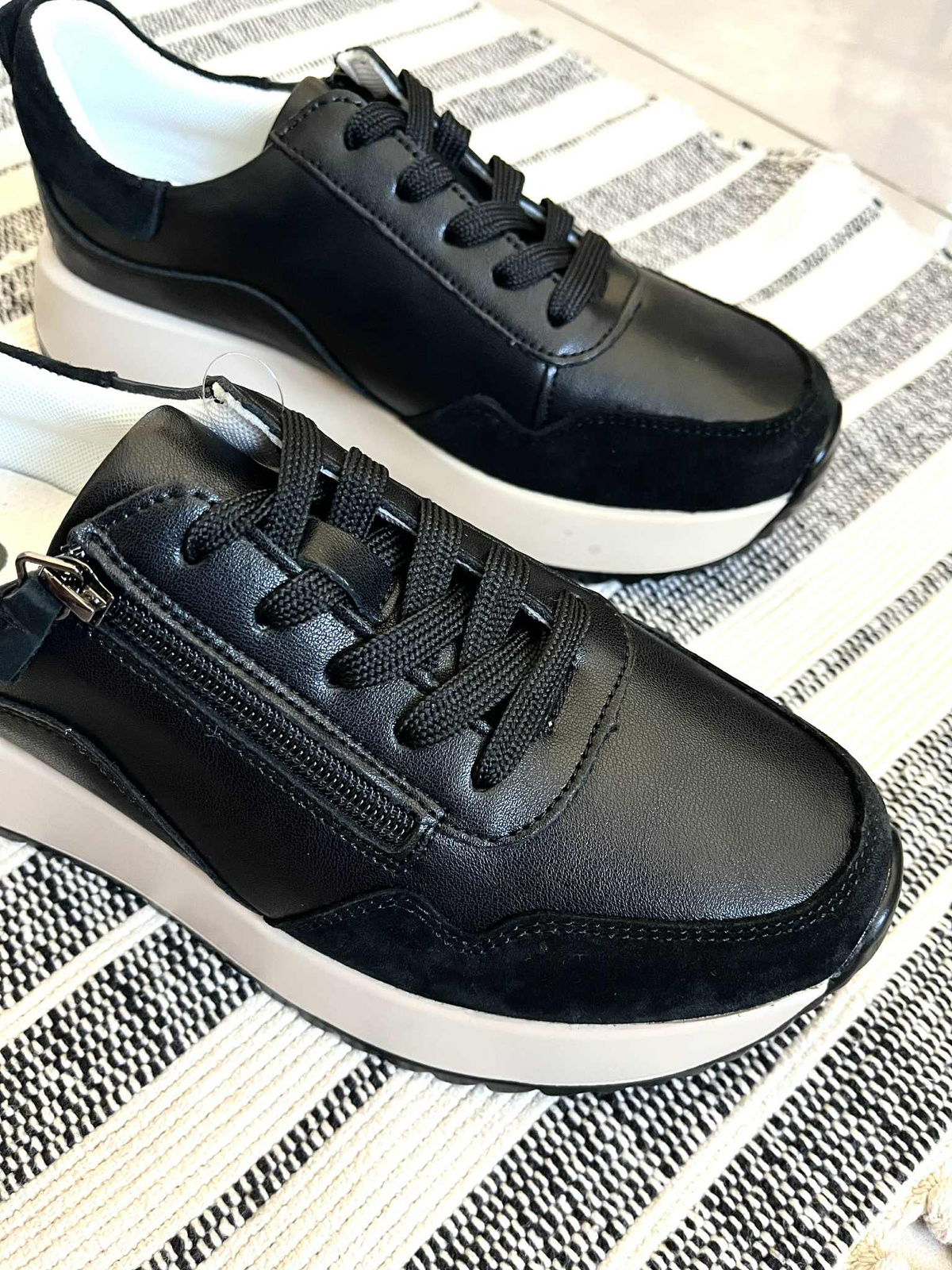 Damskie czarne sneakersy obuwie sportowe ze skóry naturalnej na wyższej platformie