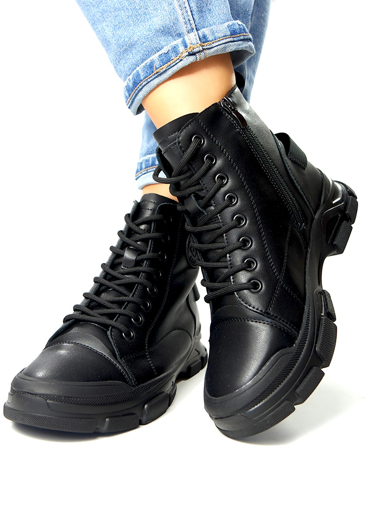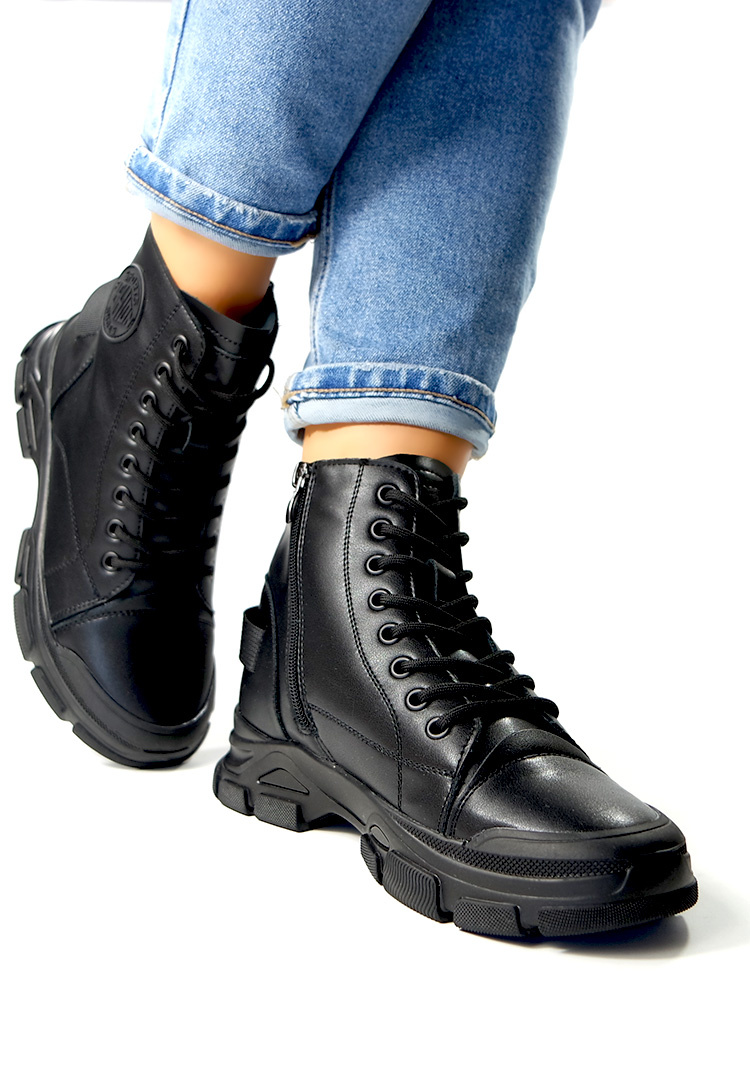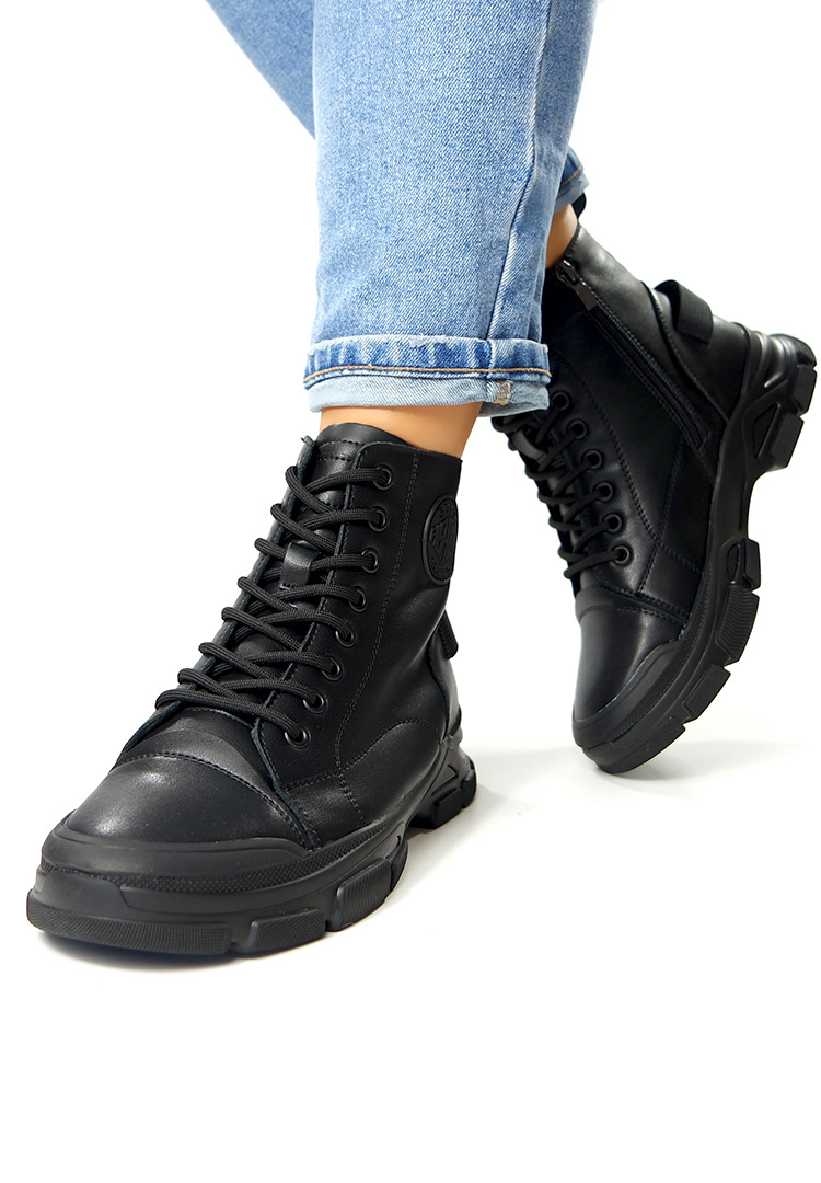 Damskie skórzane botki trapery na sezon jesień / zima. Wykonane w miękkiej skórze naturalnej. Zapinane na suwak z boku buta, dodatkowo wiązane grubymi sznurowadłami dla lepszego dopasowania buta do szerokości stopy. Modny i wygodny wzór damskich traperów. Botki na wytrzymałej karbowanej i wykonanej z gumowego tworzywa podeszwie. Przód buta dodatkowo również zabezpieczony gumową wstawką. Obuwie jesienno-zimowe zakończone na półokrągło, szerokie w palcach. Długość cholewki ok 11 cm. Szerokość u góry cholewki to ok 28 cm i więcej. Model ten posiada ocieplenie. Produkt renomowanej marki. Obuwie to cechuje wysoka jakość wykonania, komfort noszenia a przy tym niska cena. Botki damskie idealnie sprawdzą się do każdej stylizacji. Botki do sukienki, jeansów i długich spódnic. Klasyczne botki damskie ciepłe na zimowe dni. Rozmiar standardowy. Solidne damskie obuwie zimowe na gumowej podeszwie z cholewką wykonaną ze skóry naturalnej.