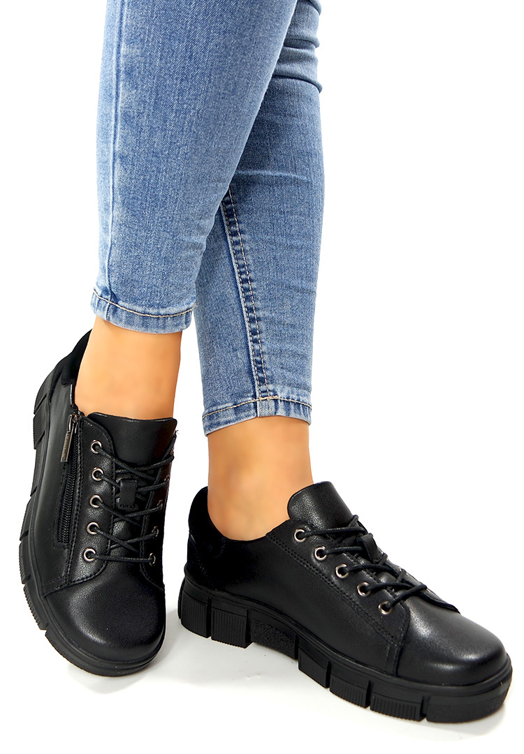 Damskie czarne sznurowane i zapinane półbuty ze skóry naturalnej