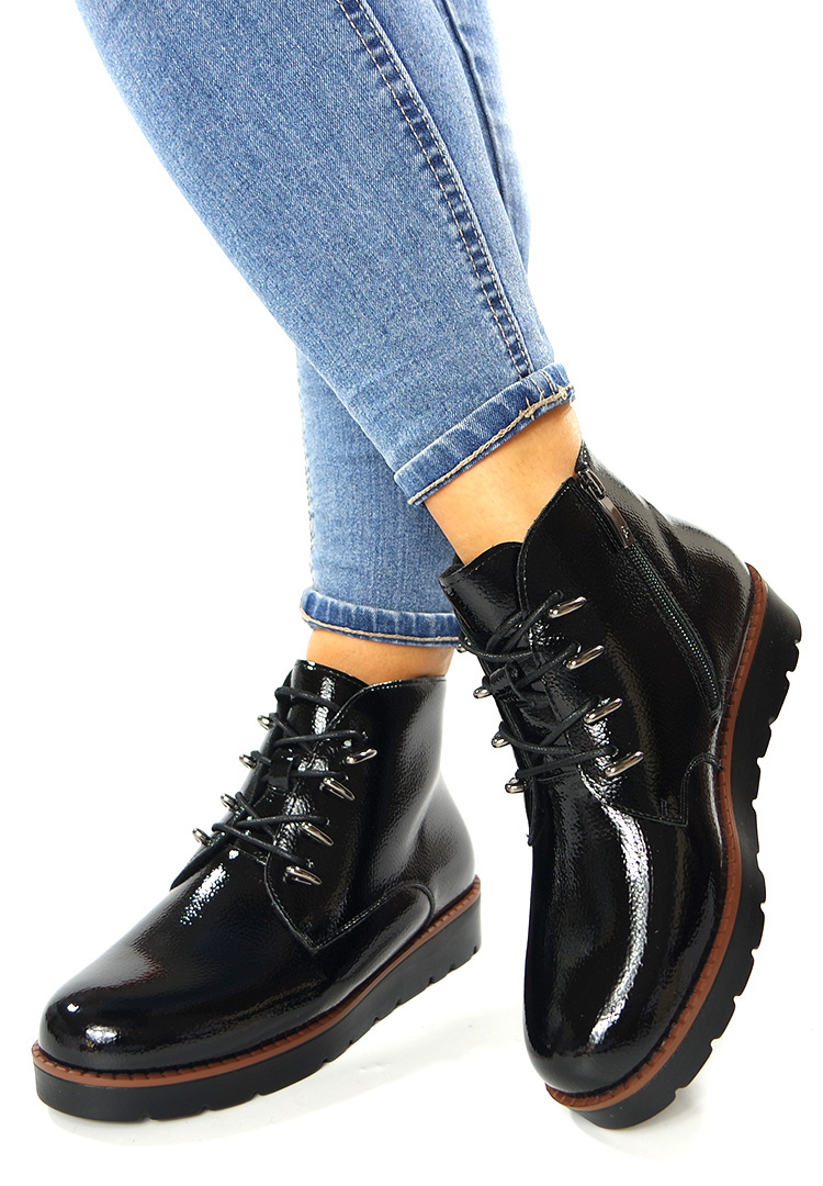 Damskie krótkie botki na sezon jesień / zima. Wykonane w miękkiej lakierowanej skórze ekologicznej. Zapinane na suwak z boku buta, dodatkowo posiadają sznurowanie dla lepszego dopasowania buta do szerokości stopy. Modny i wygodny wzór damskich botków z niższą wiązaną cholewką. Botki na wytrzymałej grubej podeszwie typu platforma. Obuwie jesienno-zimowe zakończone na półokrągło. Długość cholewki ok 10 cm. Szerokość u góry cholewki to ok 28 cm i więcej. Model ten ocieplenie. Produkt renomowanej marki Potocki. Bardzo łatwo się go zakłada i ściąga. Obuwie to cechuje wysoka jakość wykonania, komfort noszenia a przy tym niska cena. Botki damskie idealnie sprawdzą się do każdej stylizacji. Botki do sukienki, jeansów i długich spódnic. Klasyczne botki damskie ciepłe na zimowe dni. Rozmiar standardowy. Solidne damskie obuwie. Pięknie prezentują się na nodze.