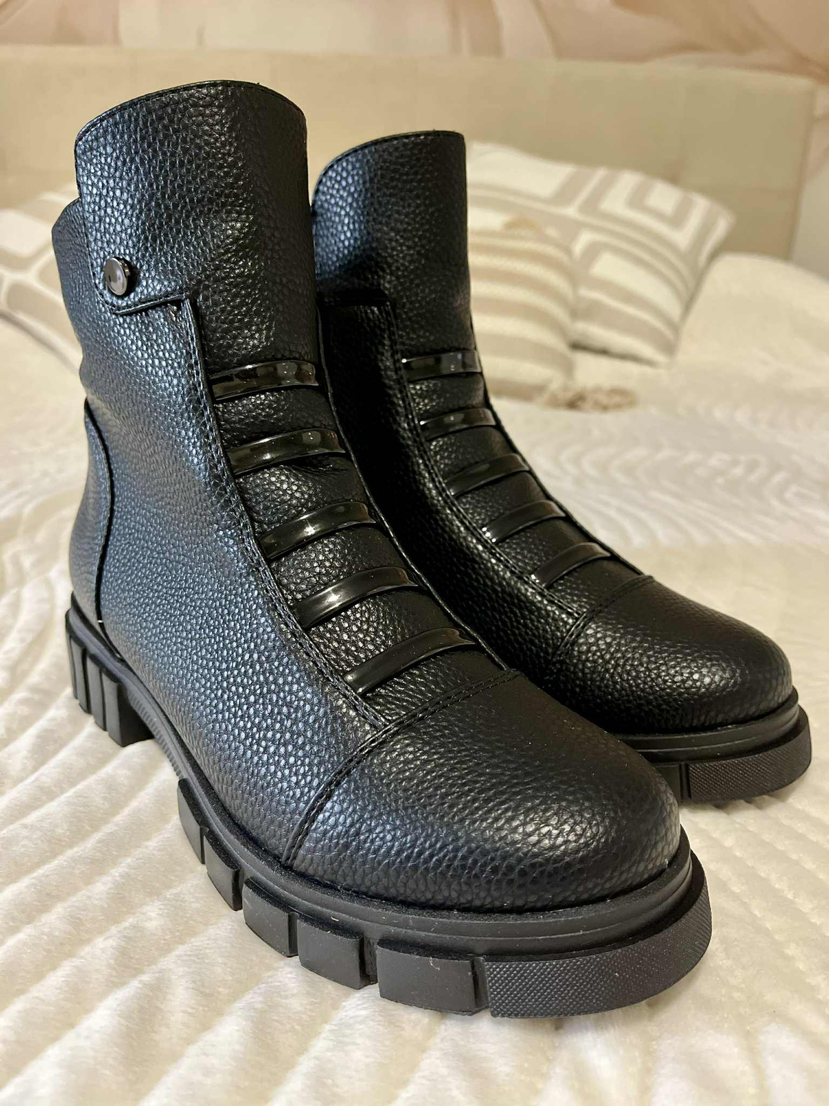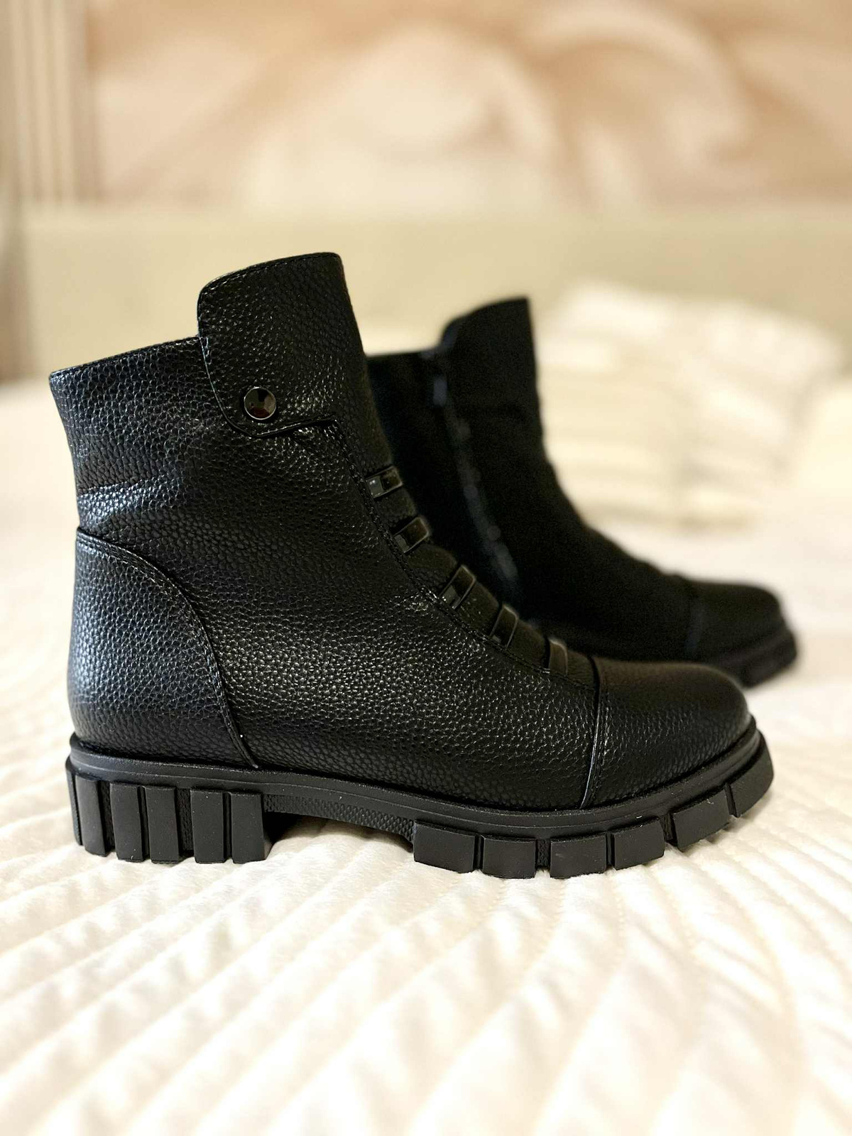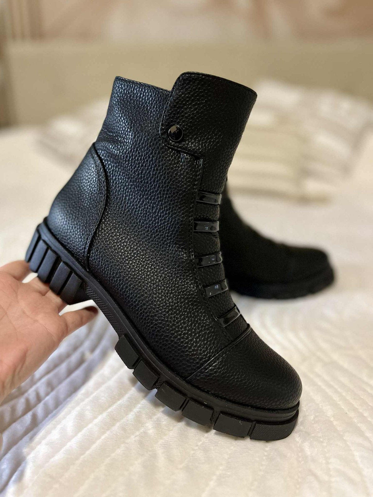 Damskie botki w bardzo miękkim materiale. Zapinane na suwak z boku buta. Wytrzymała podeszwa i niski bezfleczkowy obcas klocek. Szerokość u góry cholewki - ok. 28 cm. Długość cholewki 13 cm. Model posiada ocieplenie. Modne łączenie materiałów. Botki damskie pasują do jeansów, długiej spódnicy. Produkt polski. Obuwie od polskich producentów. Krótkie damskie botki w stylu oficerek. Te botki idealnie wpasowują się w tegoroczne modowe trendy. Czy oficerki są modne w tym sezonie? OCZYWIŚCIE! Oficerki damskie to wzór, który króluje w trendach już kolejny zimowy sezon. Damskie oficerki to szczyt wygody i komfortu. Botki z dłuższą cholewką i ociepleniem są wygodne i zawsze w nich ciepło, bez względu czy nosisz je do krótkiej spódnicy czy szortów z ciemnymi rajstopami, czy leginsów. Gruba podeszwa jest niezastąpiona podczas deszczu czy zimowej pluchy. Ten model kozaków zapinany na zamek łatwo założysz i zdejmiesz. Kolor czarny jest idealny dla tych, którzy nie lubią po każdym przejściu czyścić butów :)