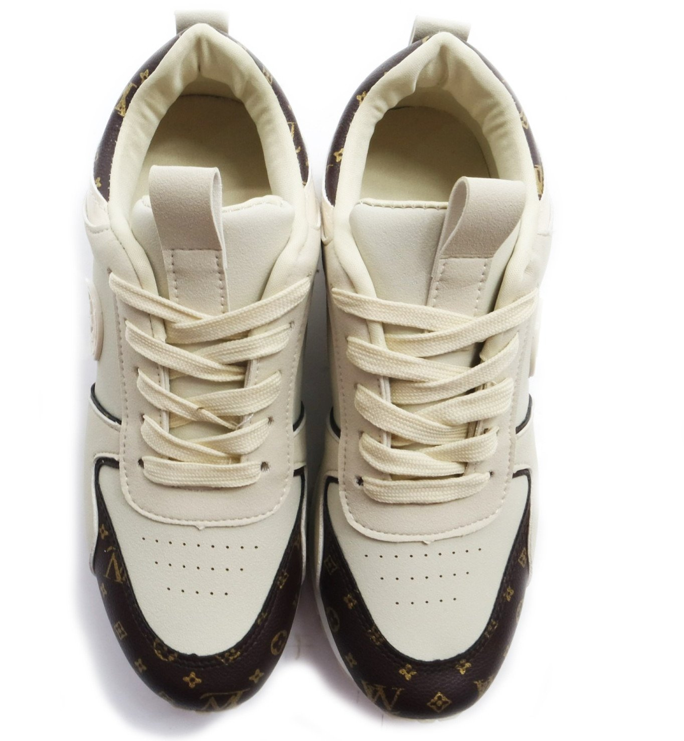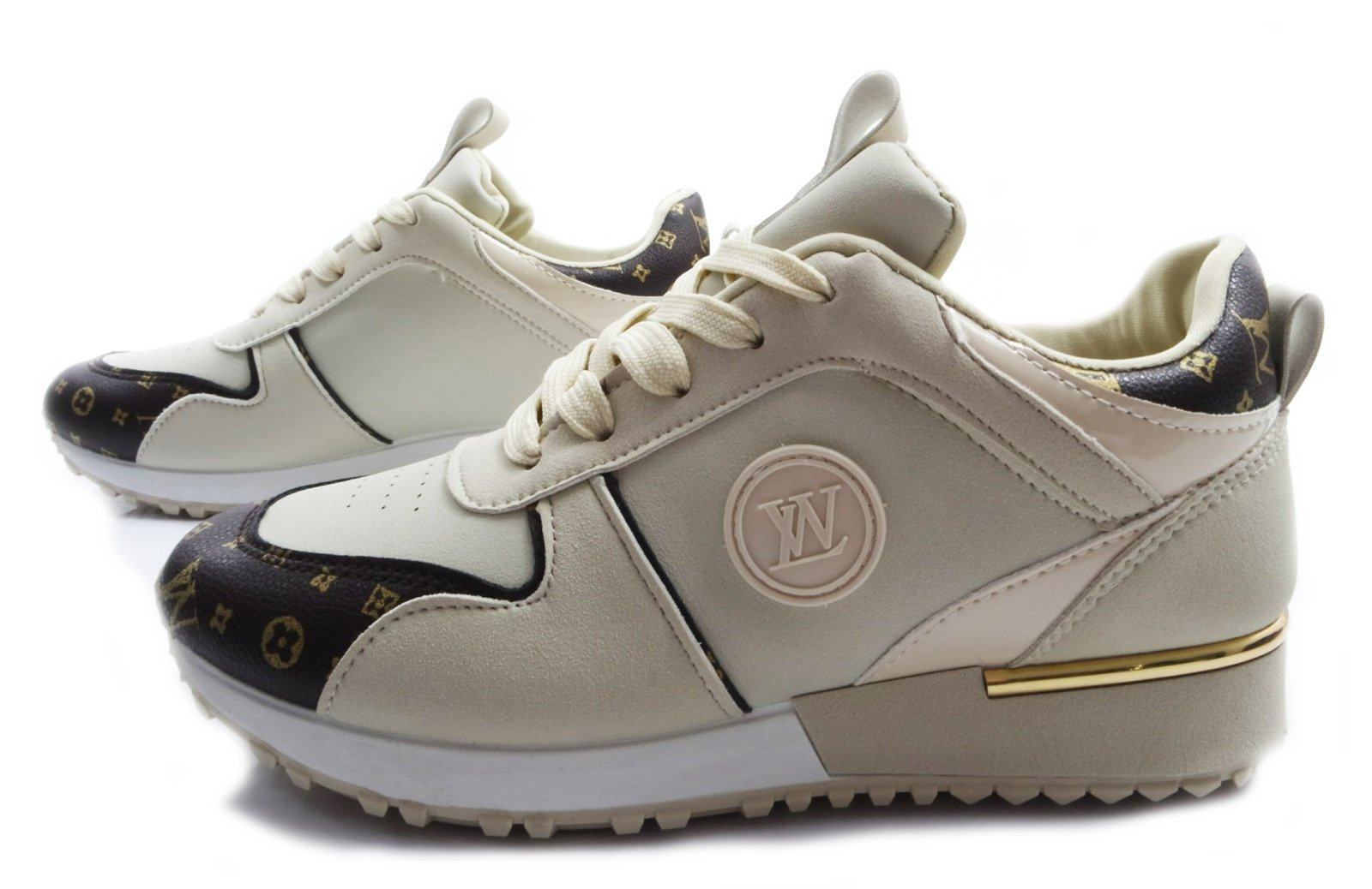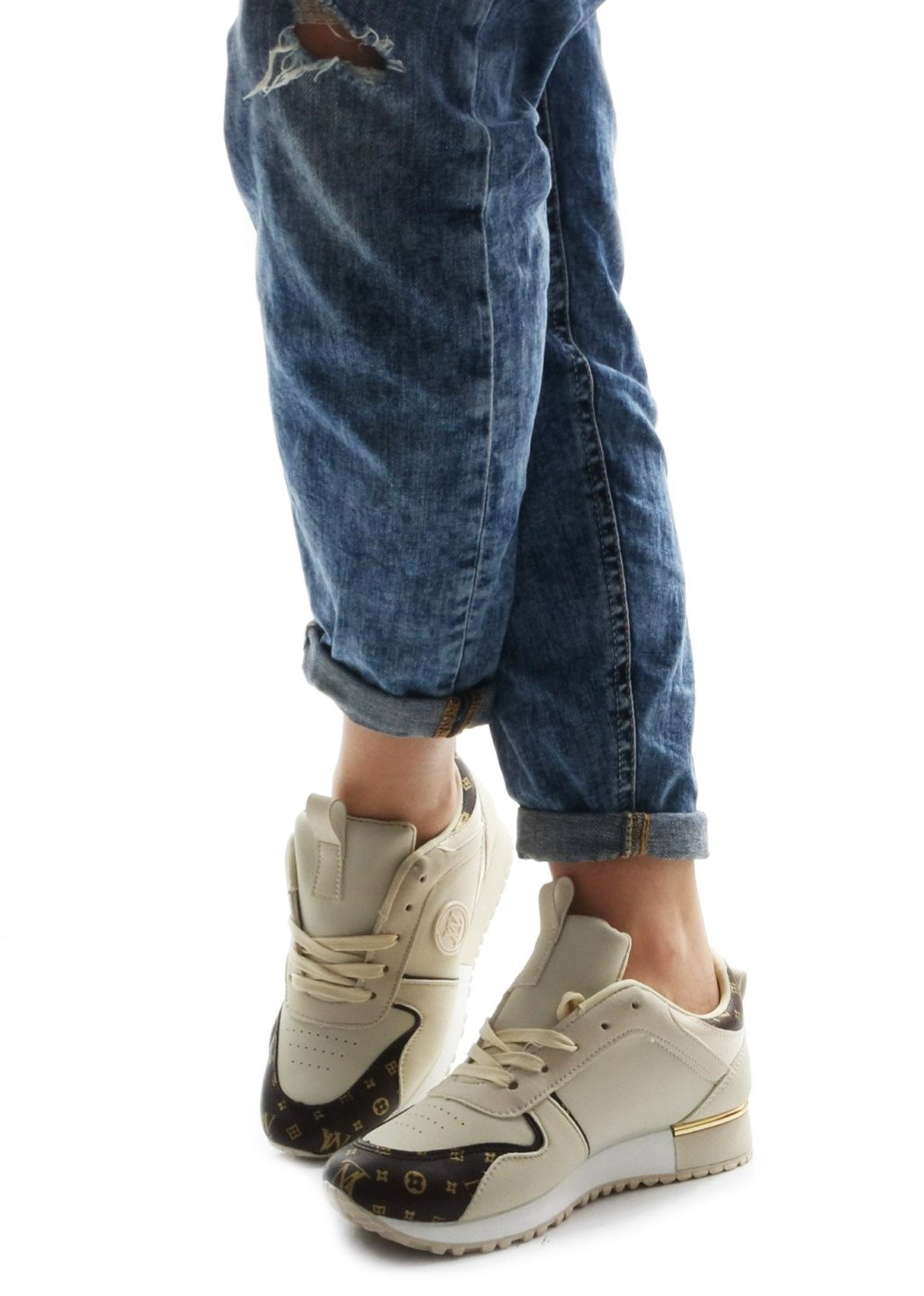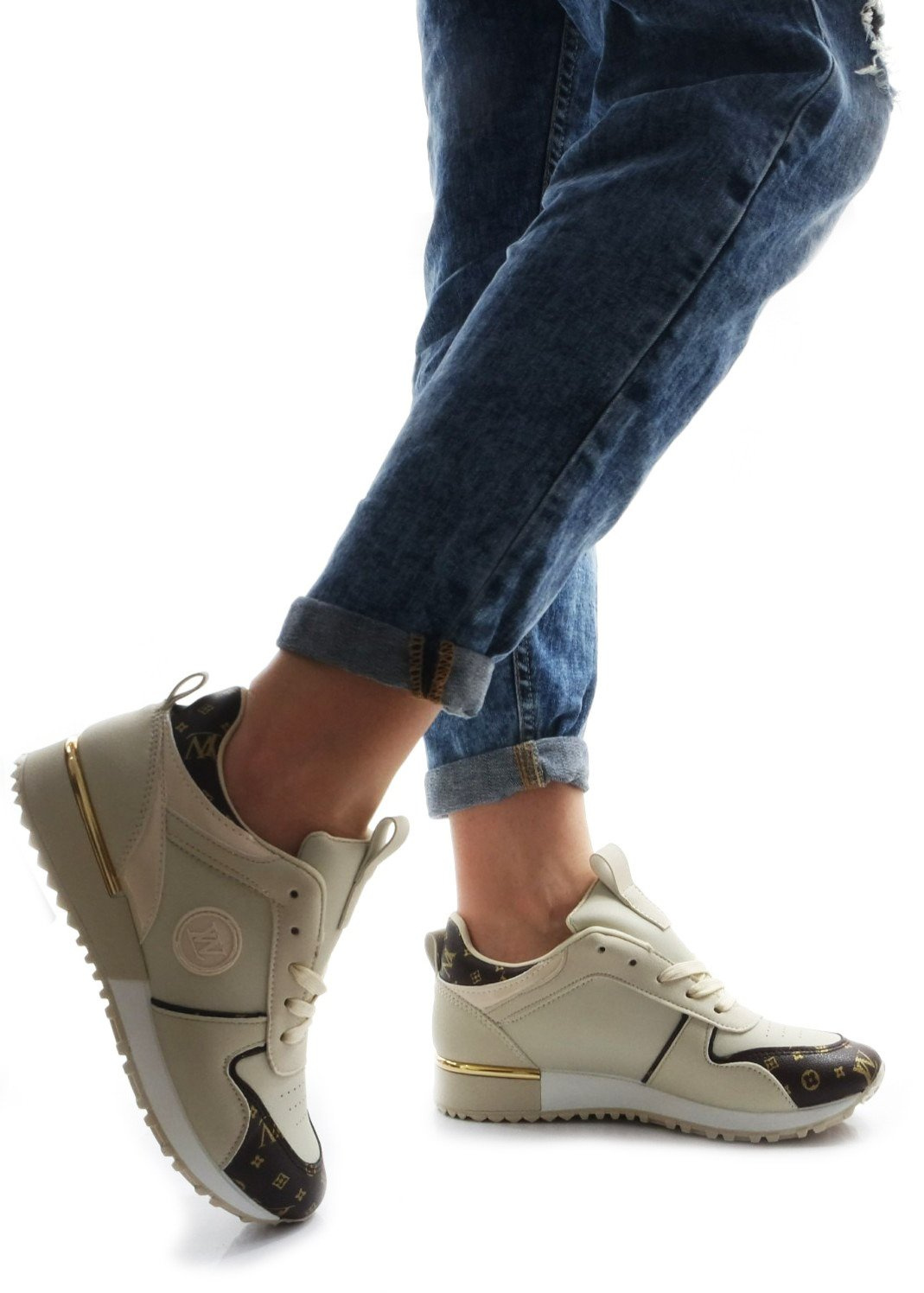 Bardzo wygodne buty sportowe osadzone na elastycznej podeszwie. Wykonane z łączonych materiałów. Pięknie przyozdobione złotymi dekorami. Na pięcie i palcach wstawka z brązowego materiału z modnym nadrukiem. Beżowe sznurówki idealnie komponują się z cholewką buta. Styl i komfort chodzenia w jednym.