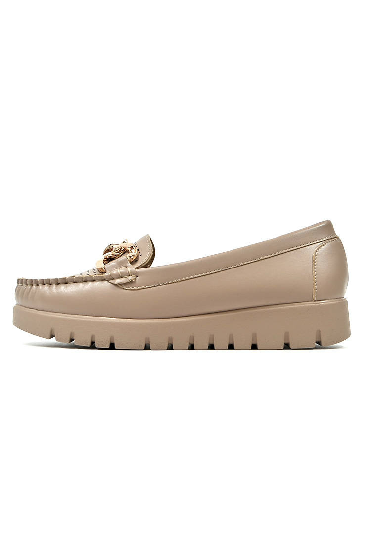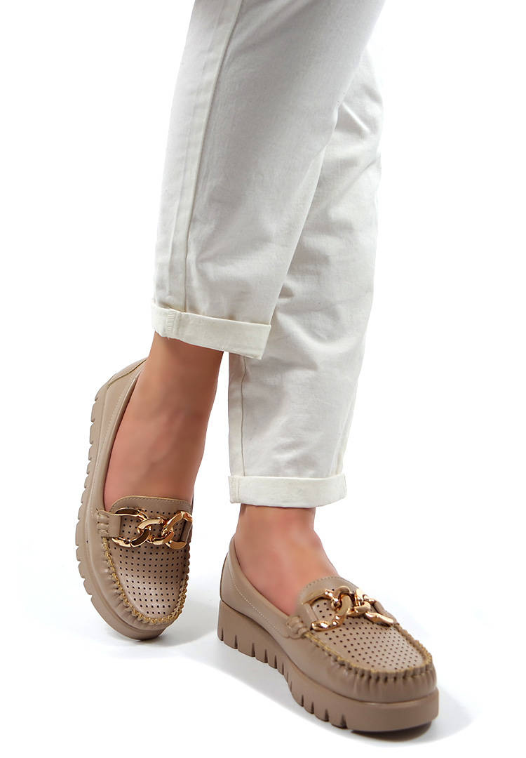 Damskie beżowe lekkie mokasyny półbuty z łańcuchem