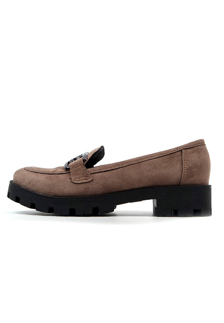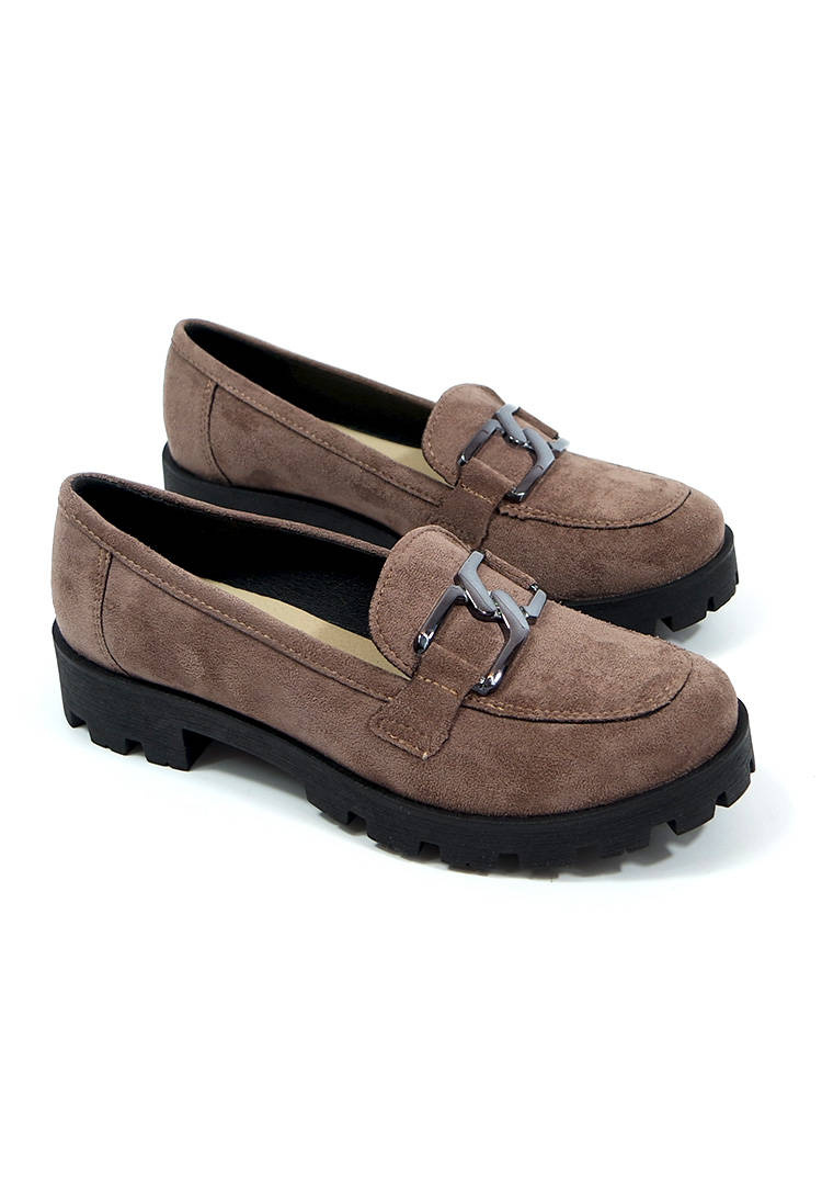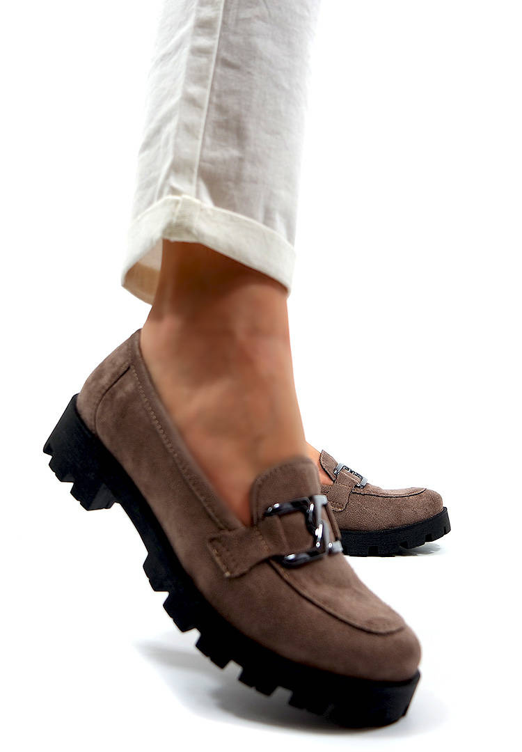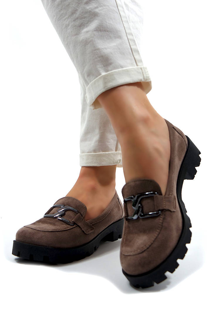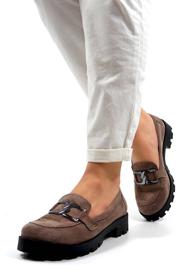 Model obuwia dla Pań ceniących sobie oryginalny styl i komfort chodzenia. Prosty fason osadzony na grubej podeszwie i klockowym obcasie o wysokości ok 3,5 cm. Wyposażony w miękką profilowaną wkładkę w środku. Buty wykonane z miękkiego zamszowego materiału. Posiadają modne zdobienie imitujące łańcuch na przodzie. Modne obuwie zakończone na półokrągło do pracy i na spacery. PRODUKT POLSKI
