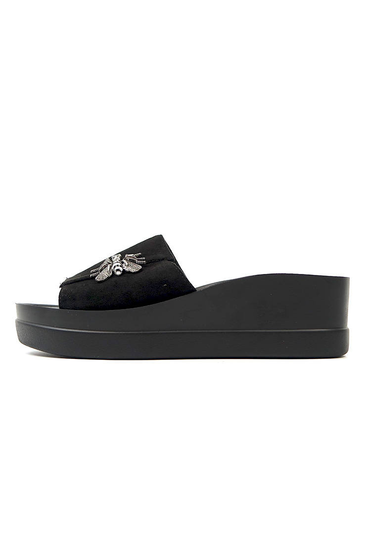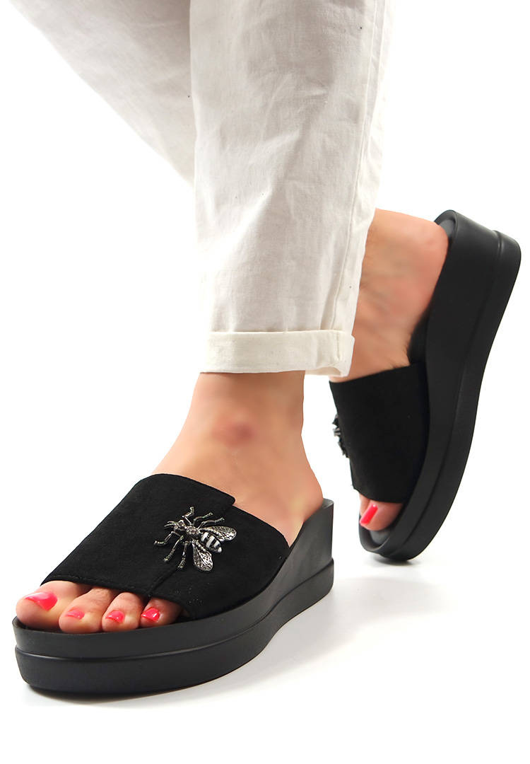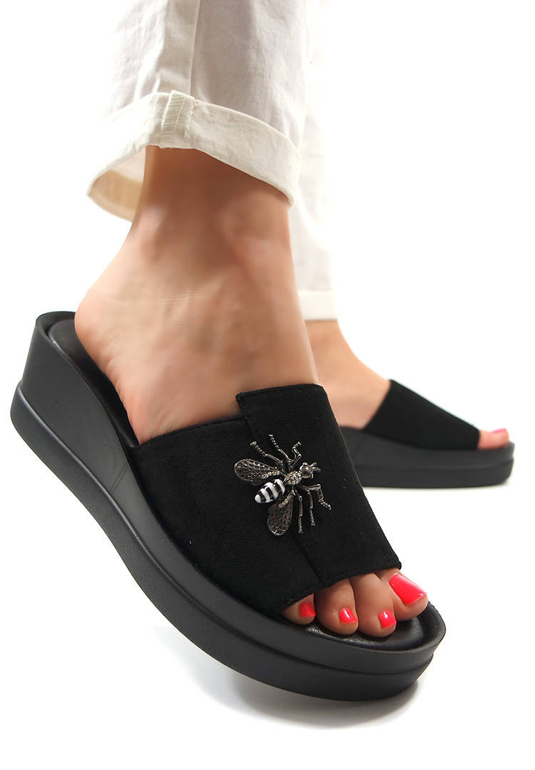 Damskie modne klapki na koturnie. Miękka wkładka w środku. Szeroki pas miękkiego materiału utrzymuje stopę stabilną. Ciekawa broszka na przodzie cholewki. Obuwie firmy Goodin. Rozmiar lekko zawyżony