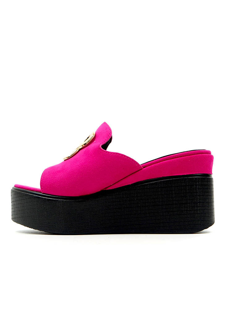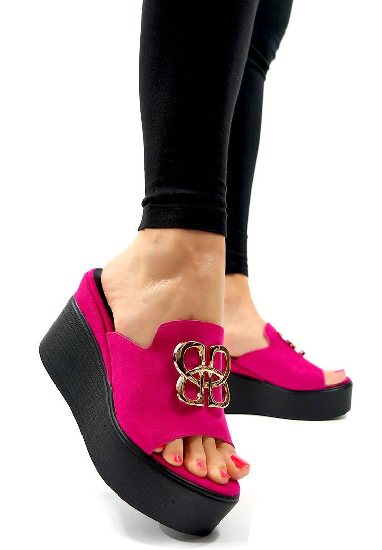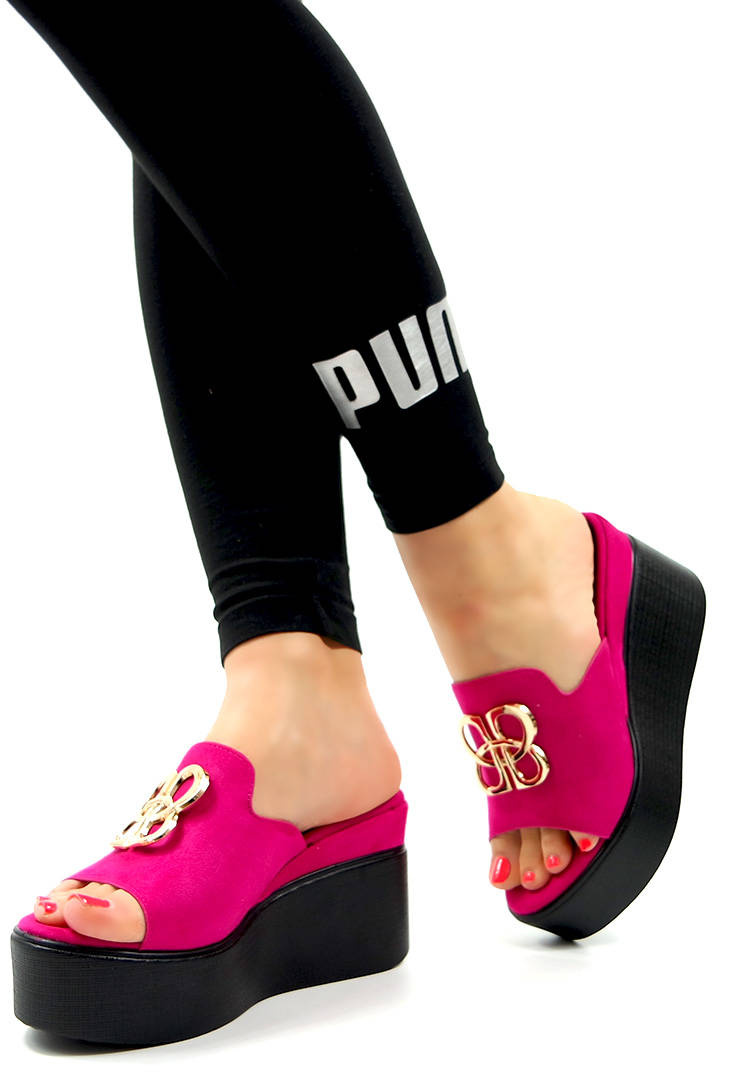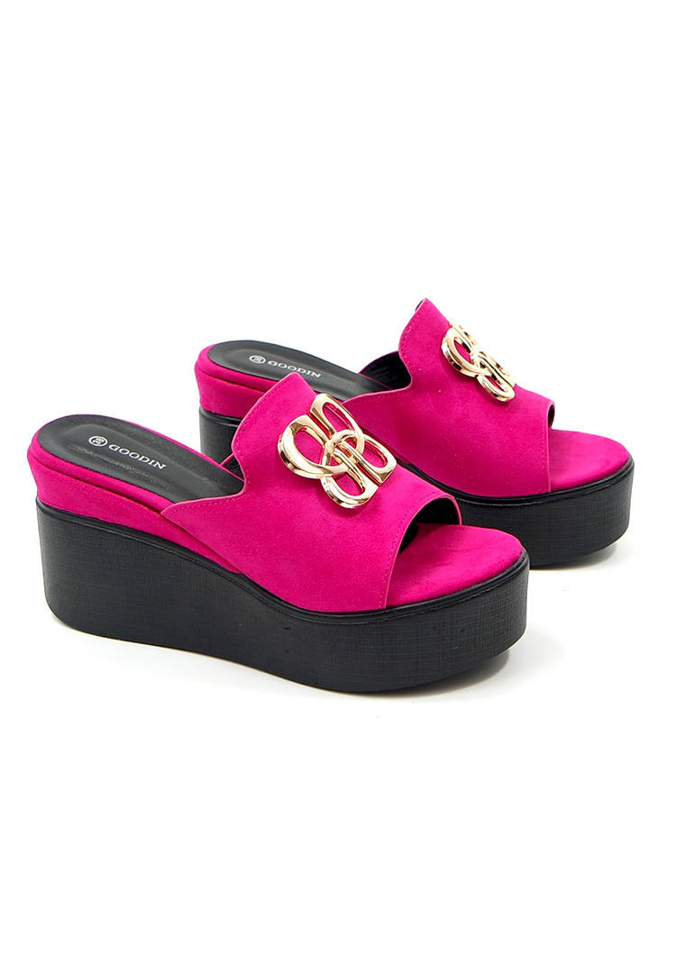 Damskie modne klapki na koturnie. Miękka wkładka w środku. Szeroki pas miękkiego materiału utrzymuje stopę stabilną. Modna ozdoba na przodzie. Obuwie firmy Goodin.