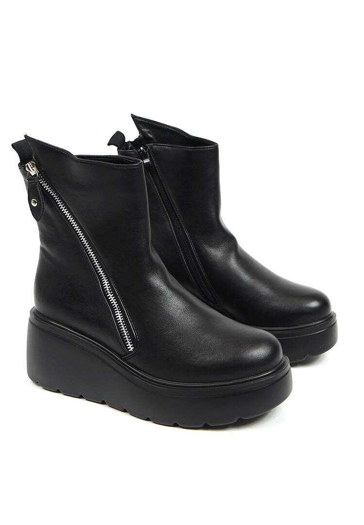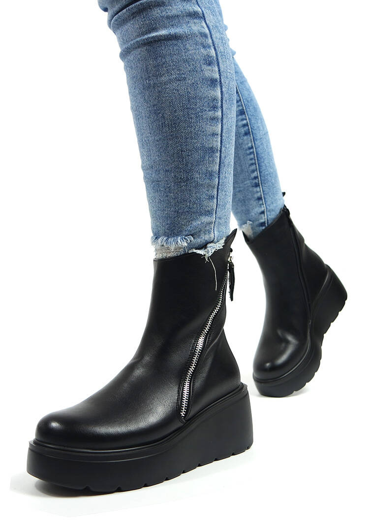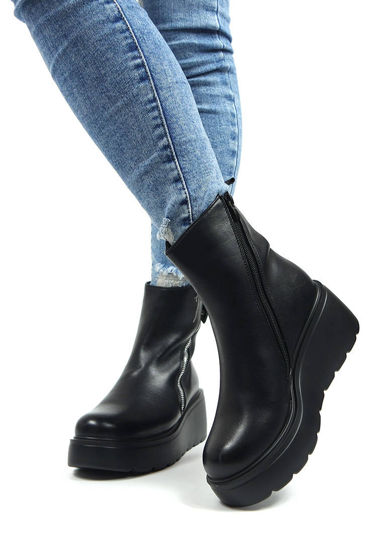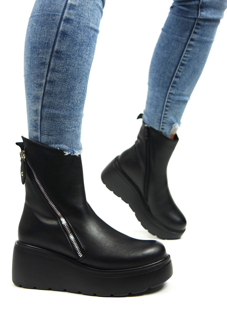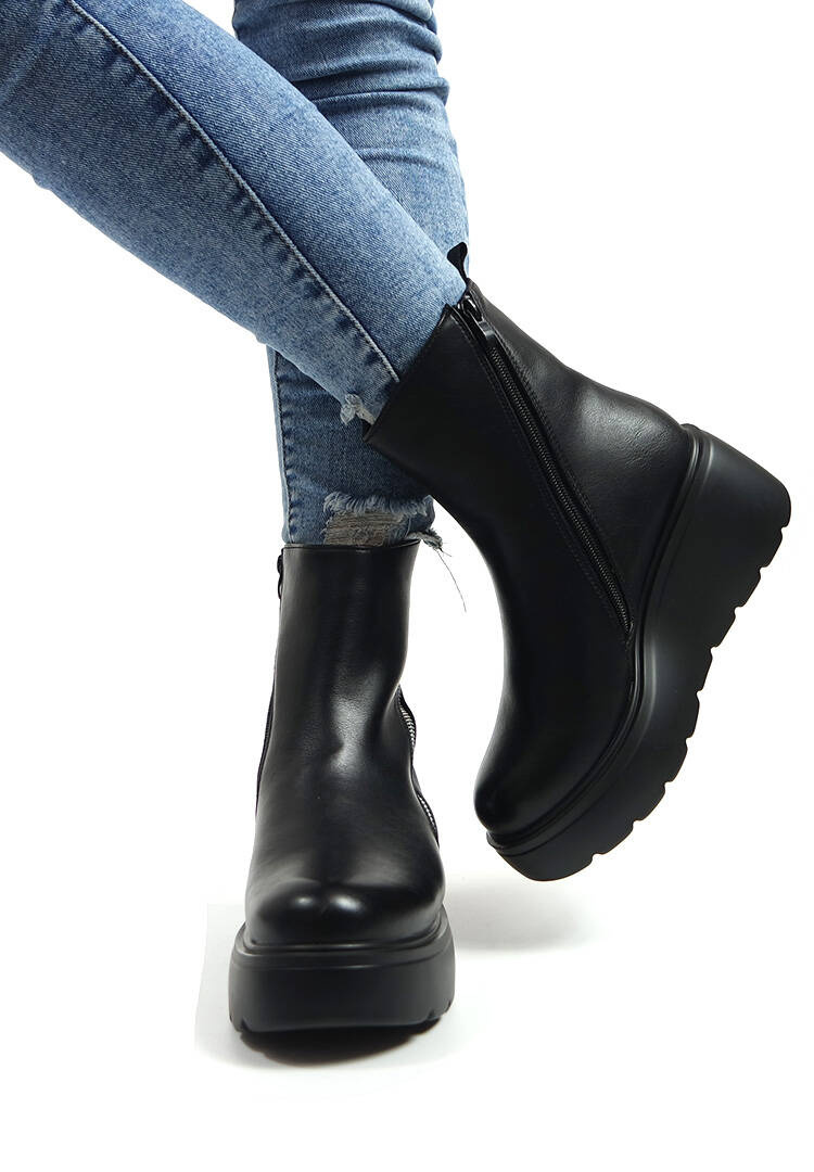 Damskie krótkie botki na platformie o wysokości ok 8 cm. Zapinane na suwak z boku buta, dodatkowo ozdobione atrapą suwaka po drugiej stronie cholewki. Wytrzymała podeszwa. Obuwie delikatnie ocieplone. Szerokość u góry cholewki - ok. 26 cm. Długość cholewki 17 cm. Produkt marki Goodin. Wysoka jakość obuwia. Damskie botki do pracy, na spacer. Klasyczne botki damskie.